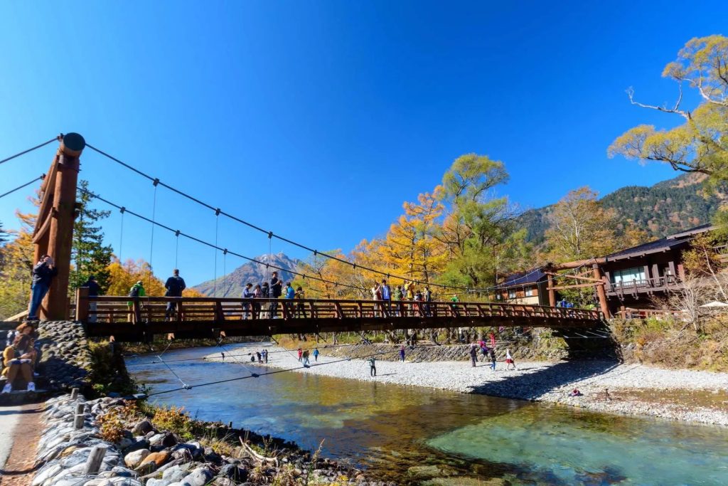 จุดถ่ายภาพในฝันของสายฮิกกิ้ง และสาย IG! สะพานไม้กลางหุบเขา ล้อมรอบด้วยยอดเขาโฮตากะ (Hotaka) ที่สะท้อนกับผิวน้ำใสราวกระจกของแม่น้ำอาซุสะ มุมนี้ถ่ายจากมุมต่ำย้อนขึ้น หรือสะพานโค้งกลางเฟรม รับรองว่าได้ภาพ “ญี่ปุ่นในฝัน” ที่ไม่เหมือนใครแน่นอน