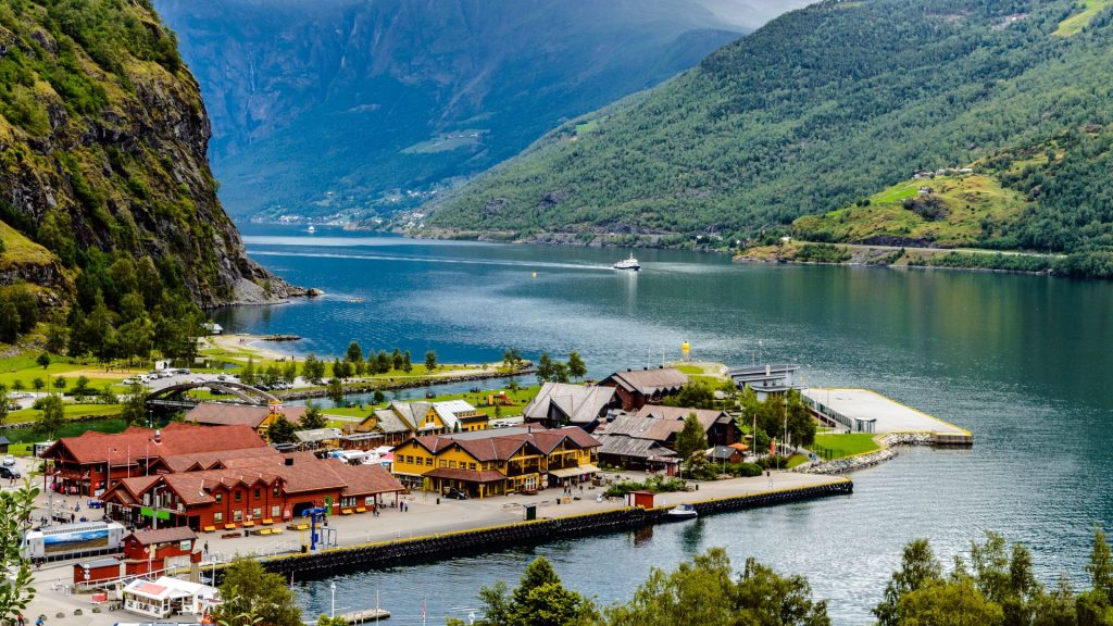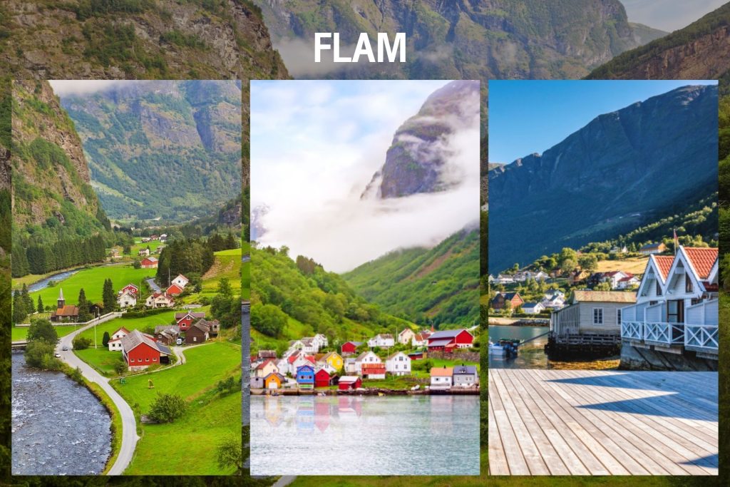 นำท่านเดินทางไปสู่ Flam (เมืองฟลอม) ตั้งอยู่ในส่วนในสุดของฟยอร์ดปากแม่น้ำฟลอม (Aurlandsfjord) ด้านหน้าเป็นเวิ้งน้ำในฟยอร์ดใสสะอาด โอบล้อมไปด้วยหุบเขา Flamsdalen Valley สูงใหญ่ เสน่ห์ที่เตะตาคืออาคารบ้านไม้สไตล์สแกนดิเนเวียสีสันสดใส ตั้งเรียงรายอยู่ริมแม่น้ำ Flåmselvi ที่ไหลผ่าน