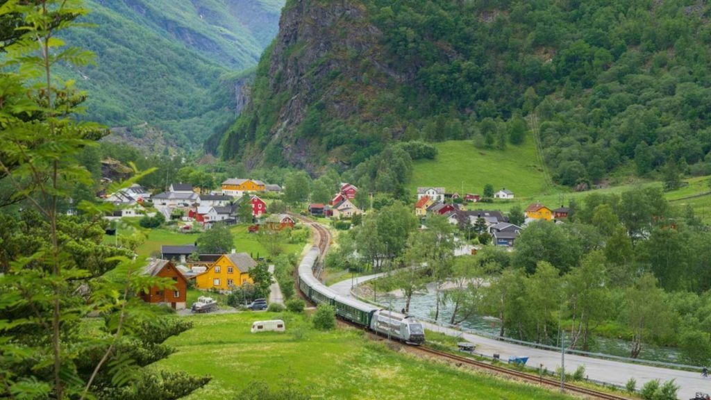 นำท่านขึ้นรถไฟขบวน no.1864 บนเส้นทาง Flamsbana (ฟลอมส์บานา) เชื่อมต่อระหว่างเมืองฟลอม (Flam) และเมืองไมร์ดาล (Myrdal) เป็นหนึ่งในเส้นทางรถไฟที่สวยที่สุดในโลก เส้นทางนี้ถูกสร้างขึ้นในช่วงสงครามโลกครั้งที่ 2 โดยใช้เวลาก่อสร้างนานถึง 20 ปี รถไฟจะวิ่งผ่านภูเขาสูงชัน อุโมงค์จำนวน 20 แห่ง และน้ำตกที่สวยงาม